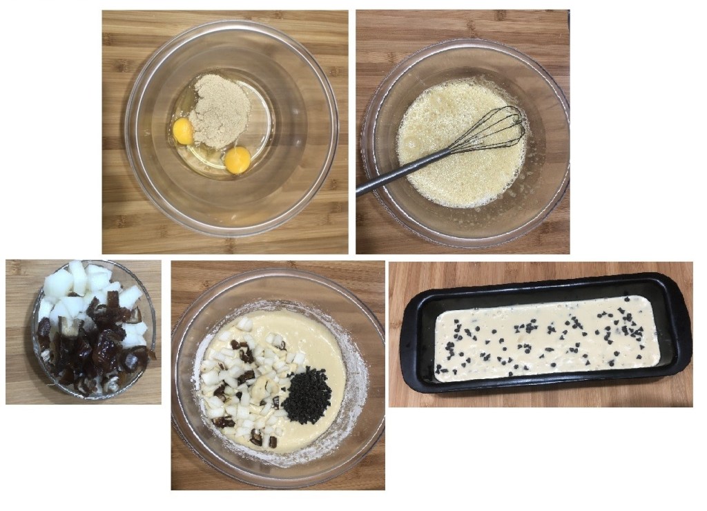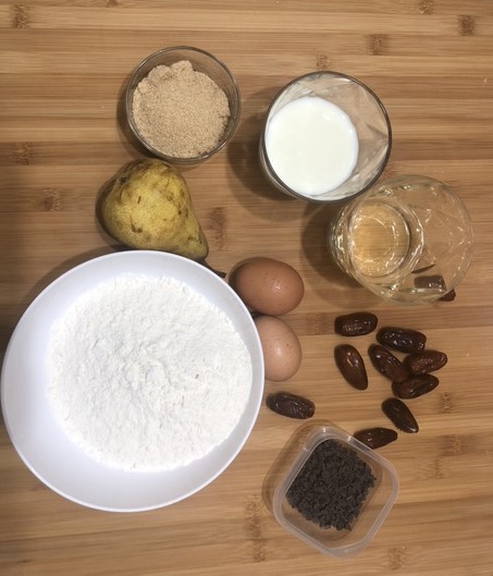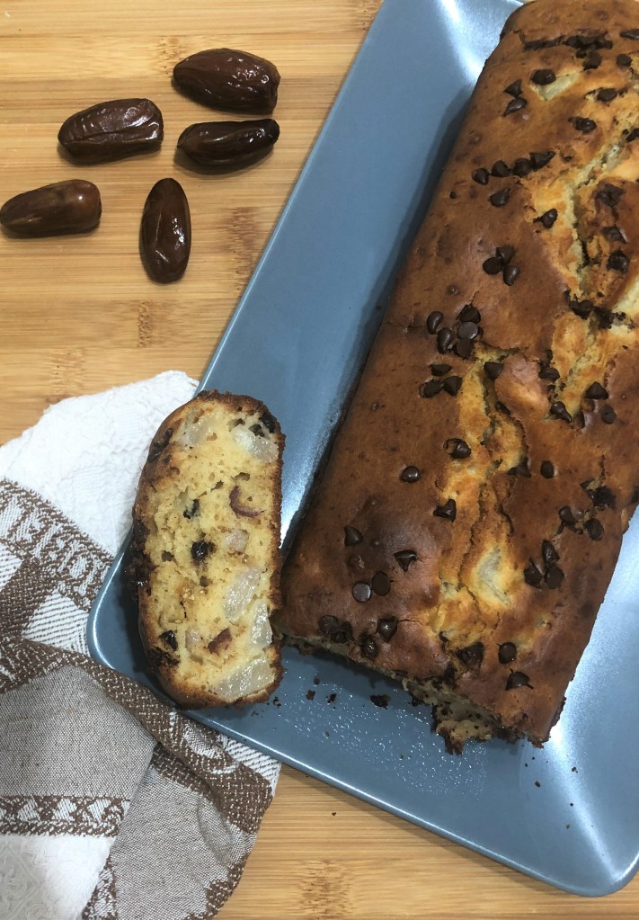 Plumcake con datteri, pere e cioccolato fondente.