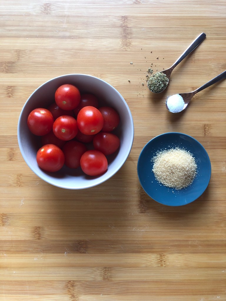 - Aggiungere sui pomodori, lo zucchero di canna, il sale e l’origano;