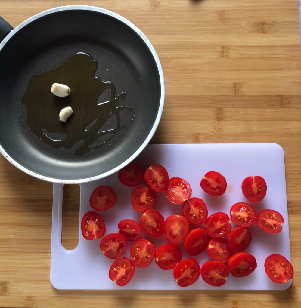 - In una padella inserire un filo di olio, l’aglio e i pomodori con il taglio rivolto verso l’altro;