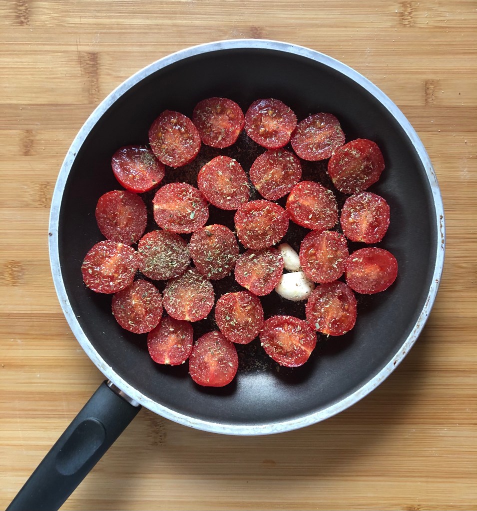 - Mettere la padella sul fornello e lasciare caramellare a fuoco lento i pomodorini finché non risulteranno morbidi;