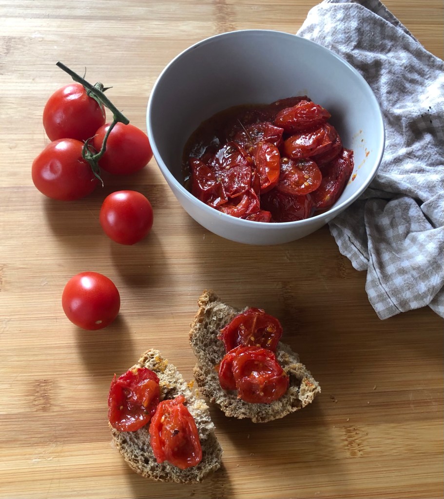 Usare i pomodorini caramellati per condire la pasta, sopra le bruschette, per farcire i pancakes salati (trovi un’idea qui https://oggicucinoio.food.blog/2021/04/26/pancakes-salati-di-farina-di-piselli-con-pomodorini-caramellati-e-formaggio-spalmabile/) o per un condire un panino con hamburger.