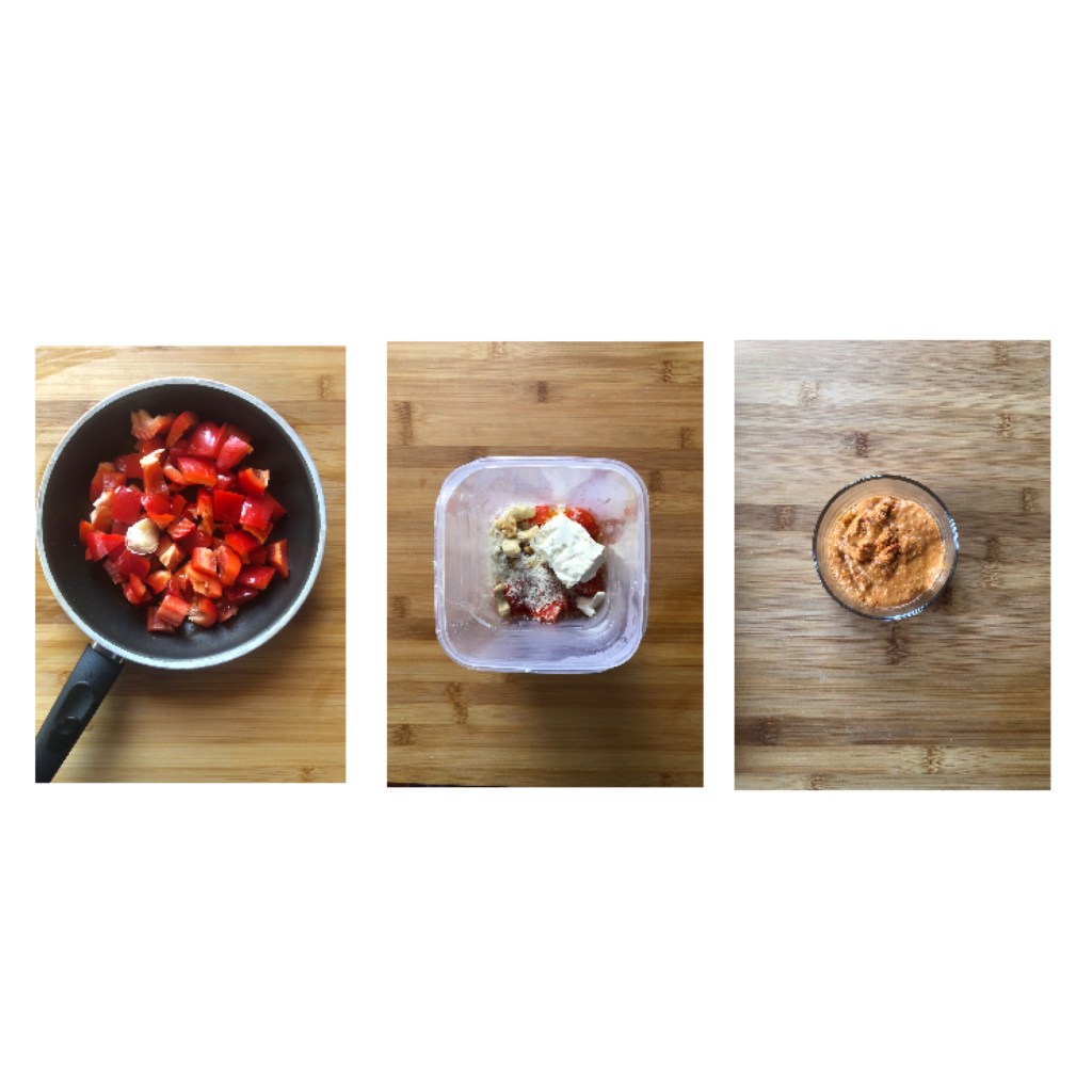 - Una volta cotti, trasferire i peperoni in un contenitore dai bordi alti, aggiungere i 2/3 della frutta secca, il parmigiano, il formaggio spalmabile e frullare con l’ausilio di un frullatore a immersione.